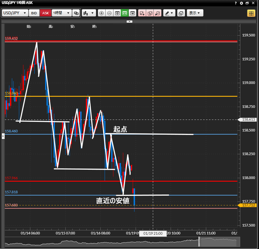 ・戦略はこの後説明するので、ここでは1時間足で安値を更新しつつあることと、直近の安値の位置を押さえておきましょう。