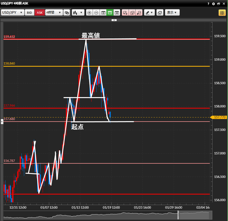 ・4時間足の起点を下抜けしたのを確認したうえで、5分足で下降トレンドを形成していた場合、5分足の前回の安値、または起点でショートでエントリーをし、キリ番157円までを狙う戦略。