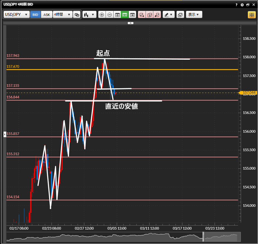・最高値の起点を超えたら、次は直近の安値の起点での動きに注目する。