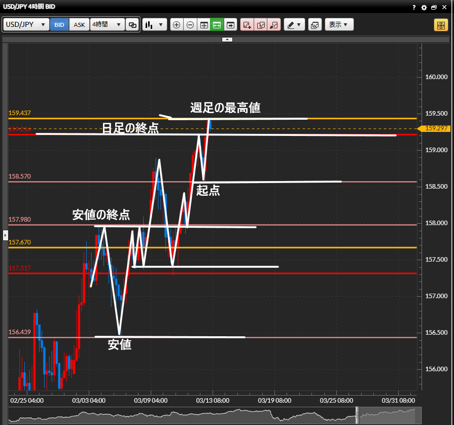 ・日足の終点の下にある、起点でサポートをされるのか、ブレイクをするのかに注目する。