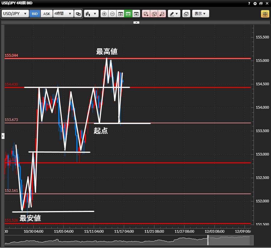 1時間足の起点を待ってからのロング戦略、もしくは5分足等で短期的な下降の波を見つけて4時間足の起点まで狙うショート戦略で行きたいと思います!