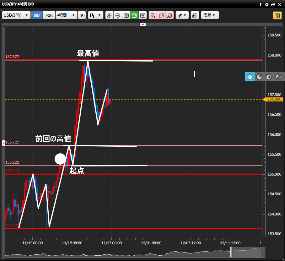 ・最高値から下落をしてきて前回の高値との半値くらいで押し目を作って上昇してきています。