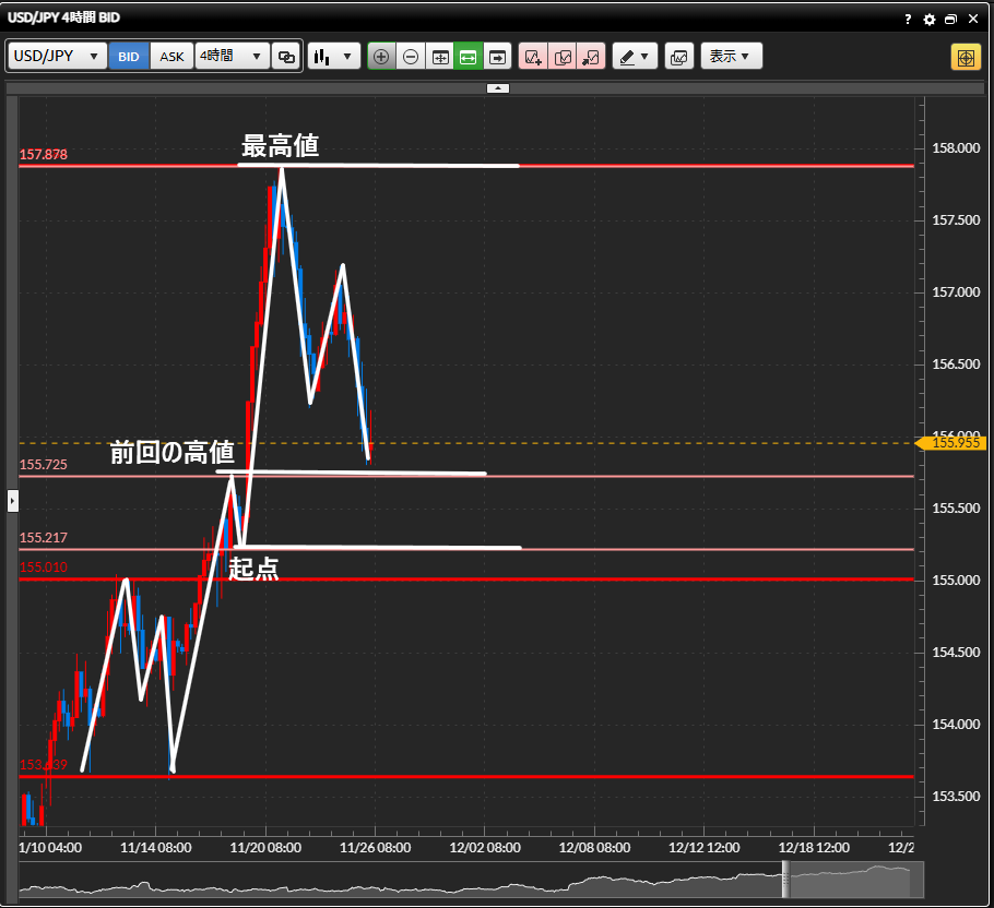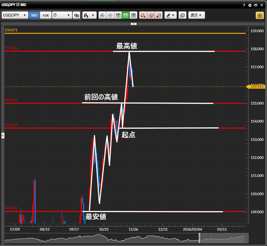 ・日足では最高値からの下落が続いており、156円のキリ番を抜けて前回の高値と最高値の半値以上下げて生きています。