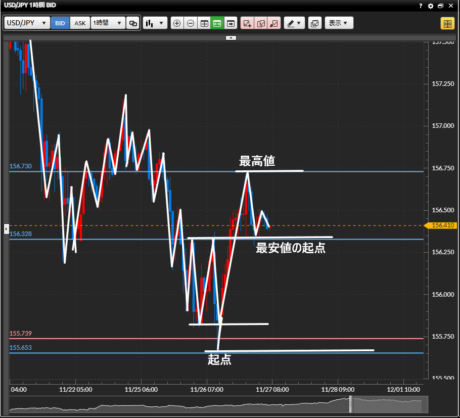 1時間足の最安値の起点を…