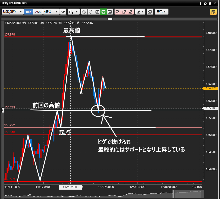 まず上を狙う根拠としては、4時間足の前回の高値でサポートされていることによる上への期待感が高まっていることです。