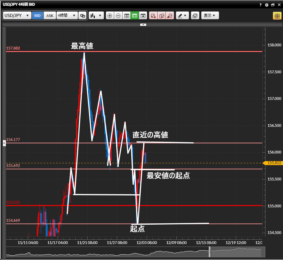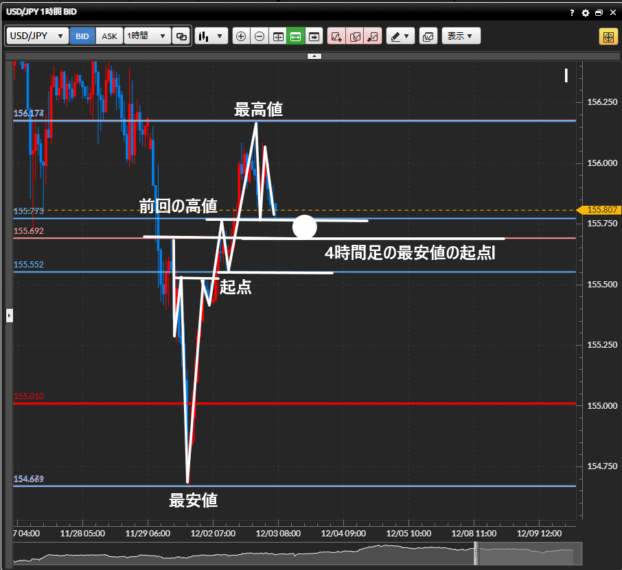 1時間足の前回の高値、または4時間足の最安値の起点…