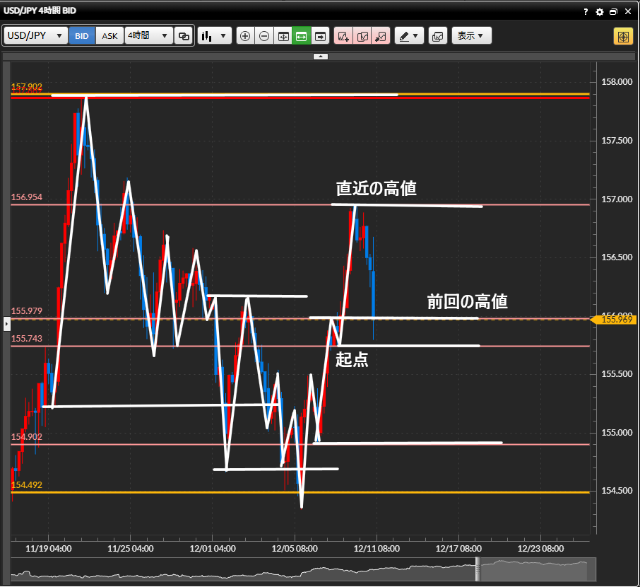 なので今回で言えば、4時間足の前回の高値を抜けずに終われば一旦持っていたポジションを手じまいするトレーダーによって上昇するかもしれない。