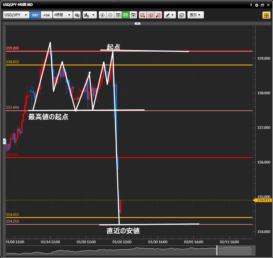・4時間足も週足の最高値によるレジスタンスで急下落をしており、日足と同じ位置に直近の安値と起点を置いている。