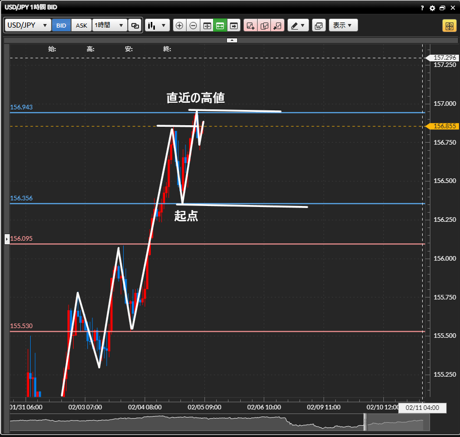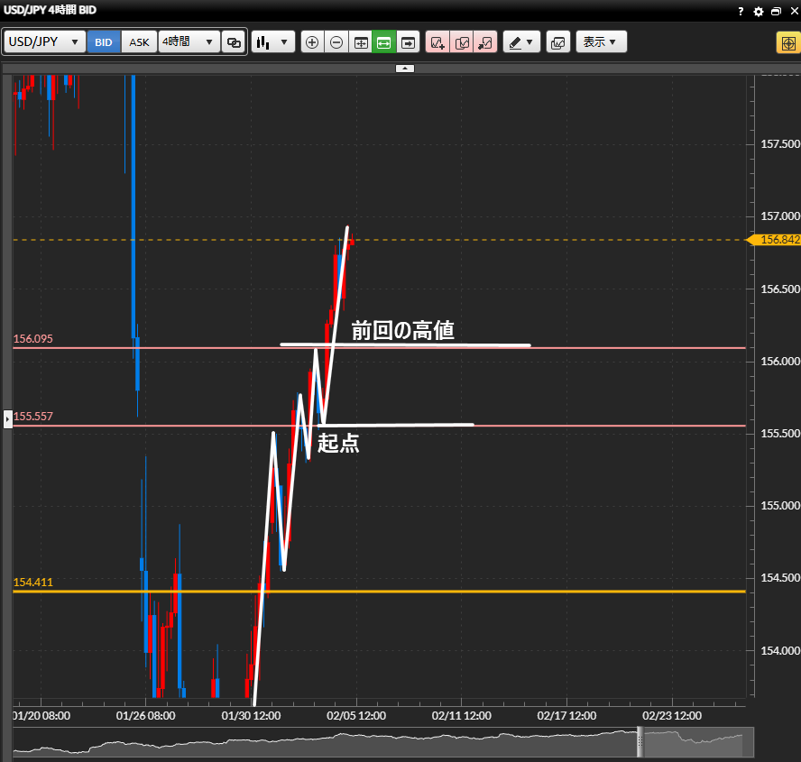 ・1時間足では157円のキリ番手前で押し目を作り、そこから再度上昇を試みています。