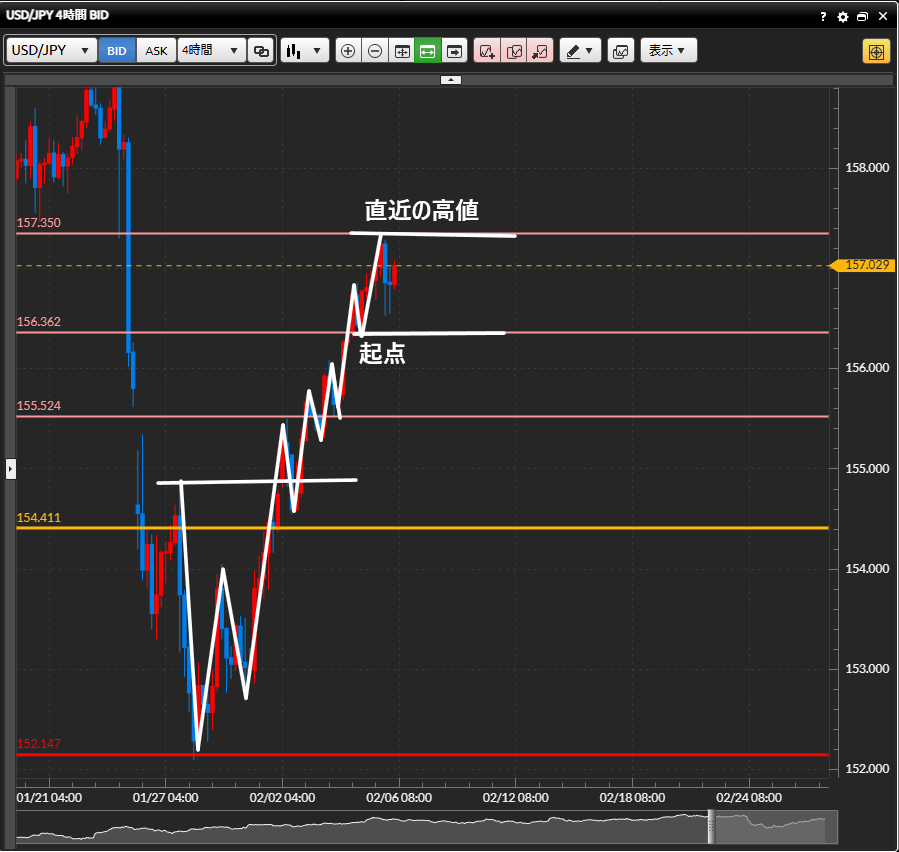 ・特に大きく下落することもありませんが、日足で話した通り157.400手前で少し反発を見せて4時間足では陰線を作る下落を見せました。