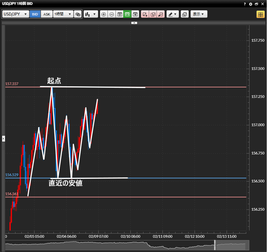 ・利確目標は最初は起点を抜けるかどうか、次にキリ番157.500、最終的に上昇の勢いが止まらなければ157.750までを狙っていきたいと考えている。