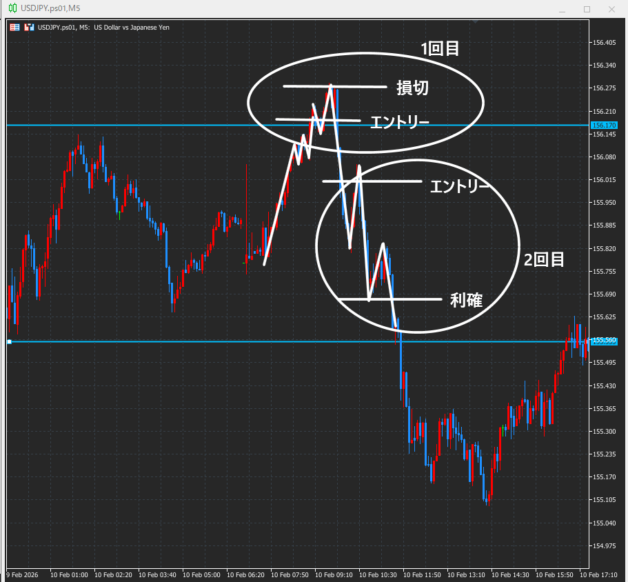 エントリー理由:1時間足の前回の安値でのレジスタンスを期待して、その後直近の安値まで落ちると仮説を立てたため(1~2回目共通)