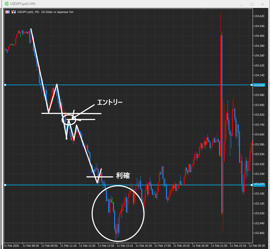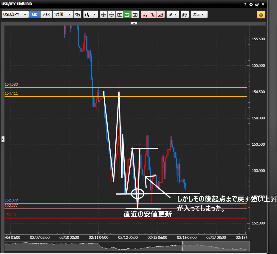・153.250で利確したあと更に下落を続けていたが、尻尾の部分だったと割り切っているので、次同じ状況に出会っても同じようなトレードをすると思う。