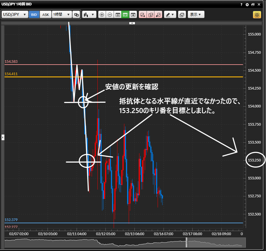 エントリー理由:1時間足の安値の更新で日足の直近の安値まで下落すると判断したため