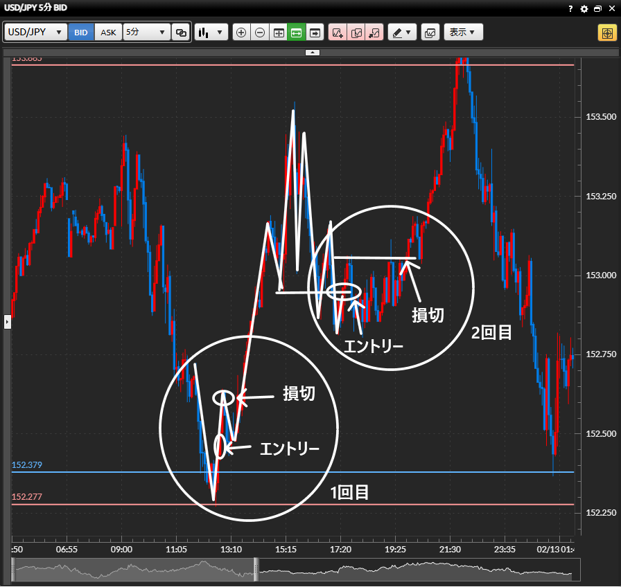 ・しかし結果的に下落しはいかず、どんどん押し戻してしまい下狙いで2回ともエントリーしたが、損切となってしまった。
