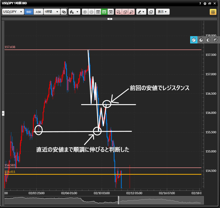 ・1回目のトレードは1時間足の前回の安値のレジスタンスを確認せずにフライングでエントリーしてしまった。結果的に損切りとなった直後に下に戻してしまった。