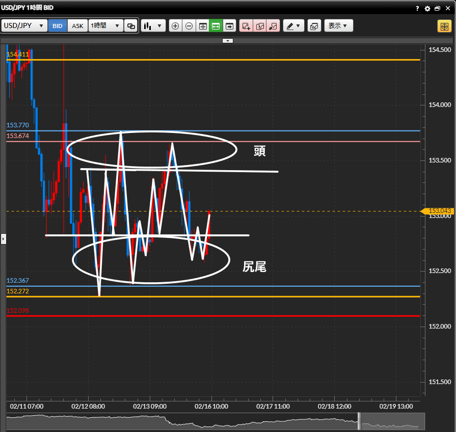 最終利確目標:上狙いの場合は頭の手前まで、下狙いの場合は尻尾の手前までを狙う。