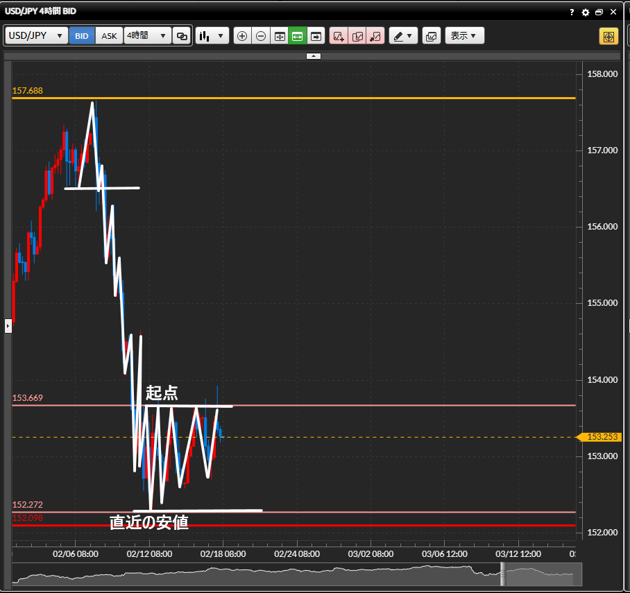 ・4時間足では日足の直近の安値手前、152.272で安値の更新が止まり、現在起点との間で上下を繰り返すレンジ相場となっている。
