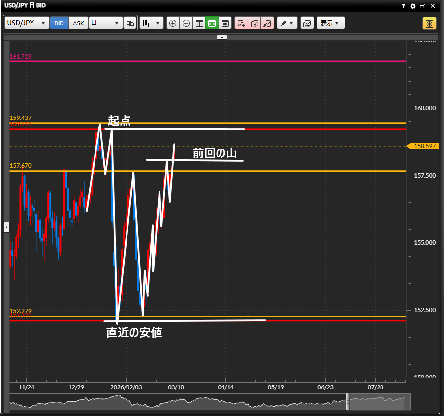 ・また途中で下落した場合は、日足の現在の安値と起点のボラの中での上昇トレンドの前回の山が意識されると見ている。