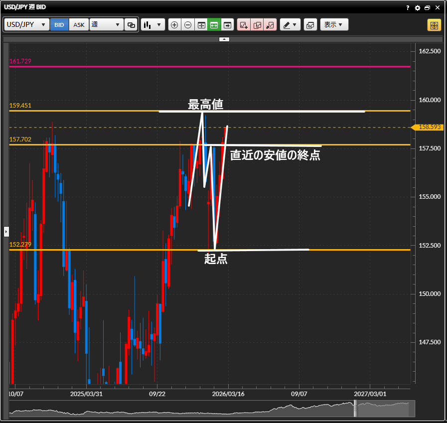 ・日足の起点と週足の最高値が大きなレジスタンスをする節目のポイントとみている。