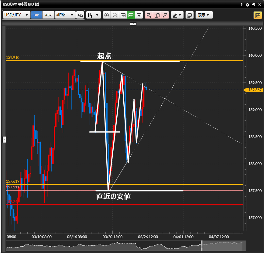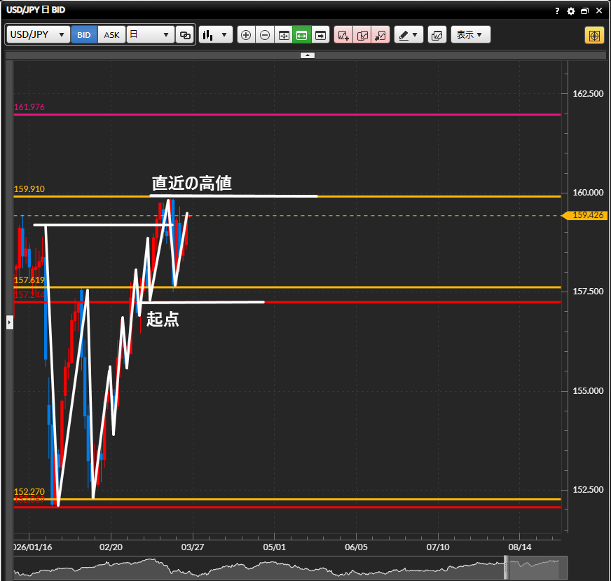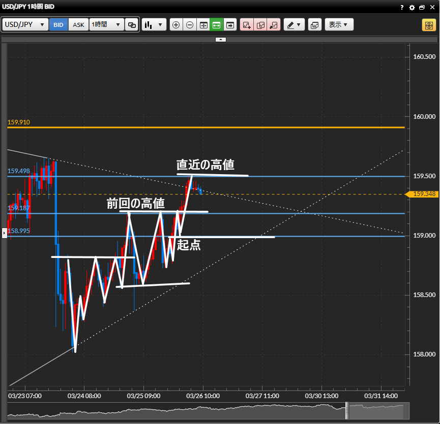 →まずは前回の高値、それをブレイクしたら次は起点といった見ていく。